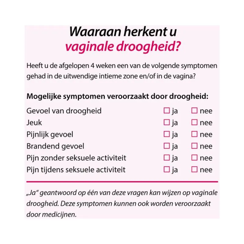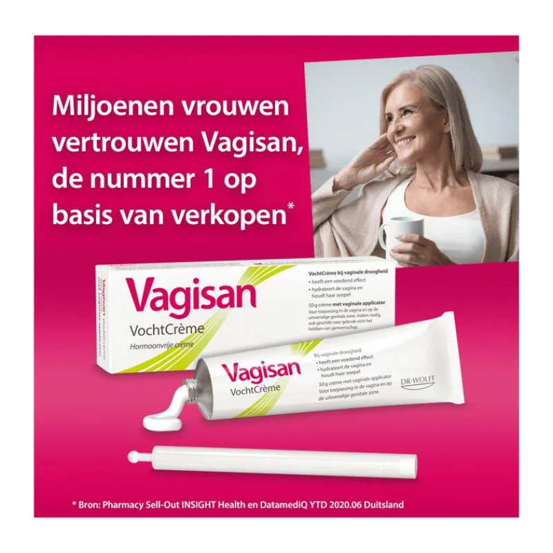 Tijdens de menopauze of overgang neemt de activiteit van de eierstokken af en produceert het lichaam minder van het vrouwelijke hormoon oestrogeen. De wanden van de vagina en slijmvliezen van de uitwendige zone kunnen hierdoor dunner en droger worden. Deze droogheid trekkerig aanvoelen. Symptomen van vaginale droogheid zijn bijvoorbeeld steken, jeuk, kleine wondjes en pijn tijdens geslachtsgemeenschap. Andere oorzaken van vaginale droogheid kunnen zijn: anti-oestrogeen behandeling, anticonceptie pil, medicijn gebruik, chemotherapie, radiotherapie, zwangerschap en borstvoeding.Vagisan VochtCrème biedt een oplossing tegen vaginale droogheid en daar dragen twee effecten voornamelijk aan bij:• de crème heeft een hoog watergehalte en hydrateert hierdoor de huid in de vagina en de uitwendige genitale zone• voedende lipiden (vetten) houden de huid soepel. Vagisan Vochtcrème is hormoonvrij en met de toevoeging van melkzuur heeft de crème een pH van 4,5. Hierdoor helpt Vagisan VochtCrème een natuurlijke pH in de vagina te bewaren. Vagisan VochtCrème is bestemd voor toepassing in de vagina en op de uitwendige intieme zone en kan worden aangebracht met of zonder een applicator