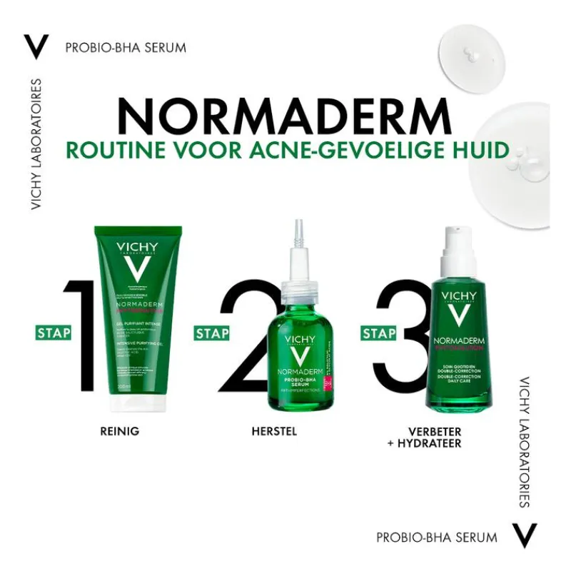 Het Normaderm Probio-BHA Anti-Imperfecties Serum van Vichy is een geconcentreerd serum dat helpt bij het verminderen van huidimperfecties veroorzaakt door hormonale acne. Ideaal voor mensen met een gevoelige, acnegevoelige huid, dit serum corrigeert imperfecties en verbetert de huidtextuur. De effectiviteit is klinisch getest.