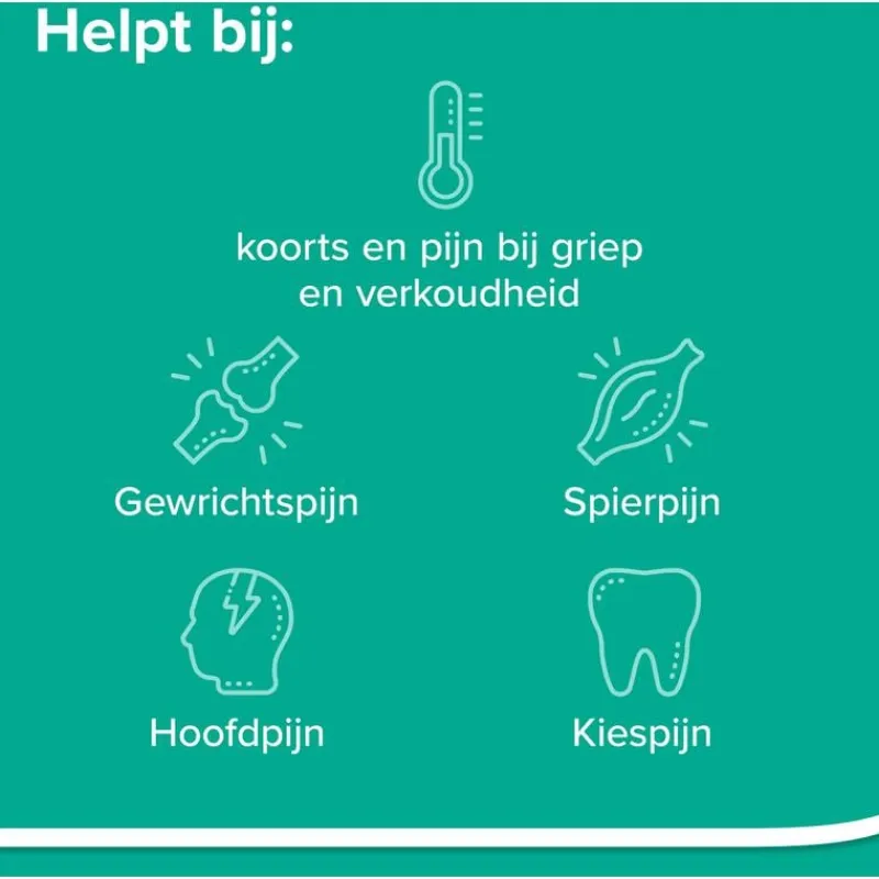 Indicatie: Ter verlichting van hoofdpijn, reumatische pijn, spierpijn, spit, menstruatiepijn, tand- en kiespijn, pijn en koorts bij griep en verkoudheid en pijn en koorts bij vaccinatie.