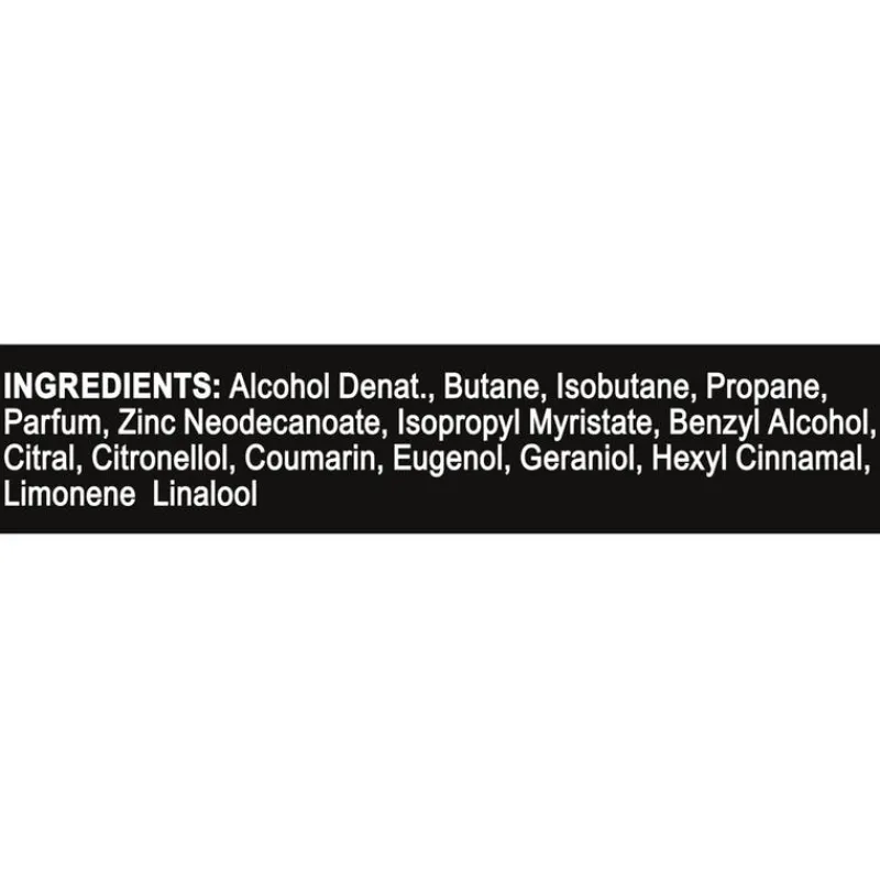 Alcohol Denat., Butane, Isobutane, Propane, Parfum, Zinc Neodecanoate, Isopropyl Myristate, Benzyl Alcohol, Citral, Citronellol, Coumarin, Eugenol, Geraniol, Hexyl Cinnamal, Limonene, Linalool.
