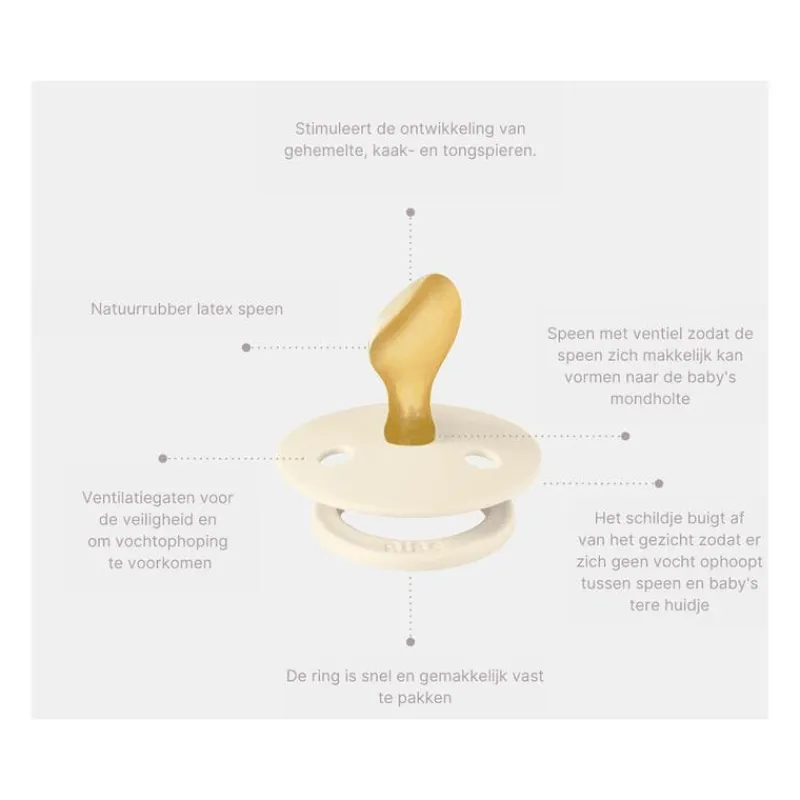 • Natuurrubber latex is extra zacht en heeft daardoor minder impact op de (doorkomende) tandjes (rubber is een natuurlijk materiaal en daarom kunnen er lichte kleurafwijkingen optreden.)