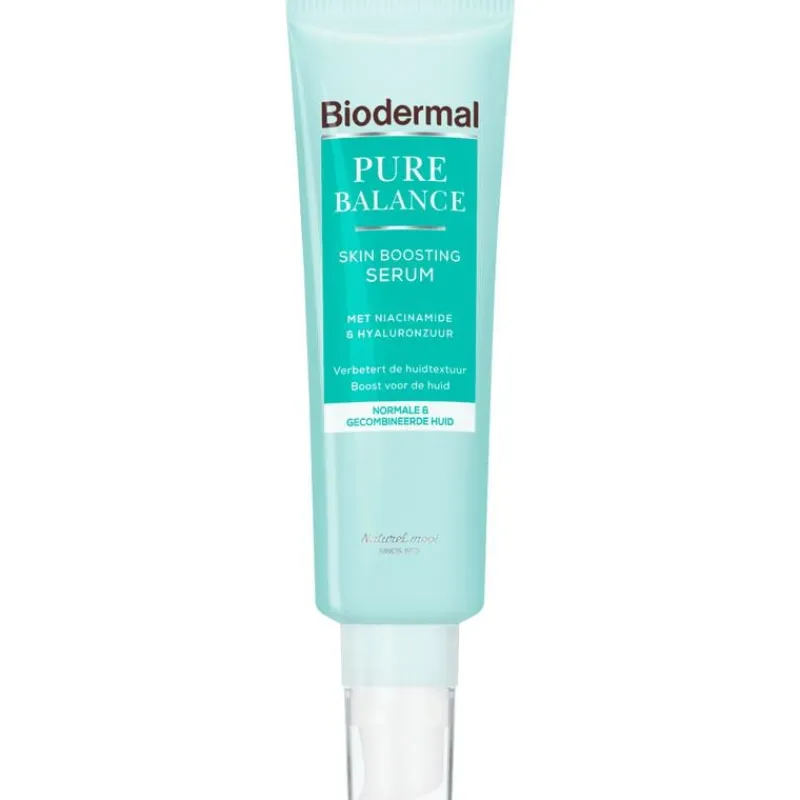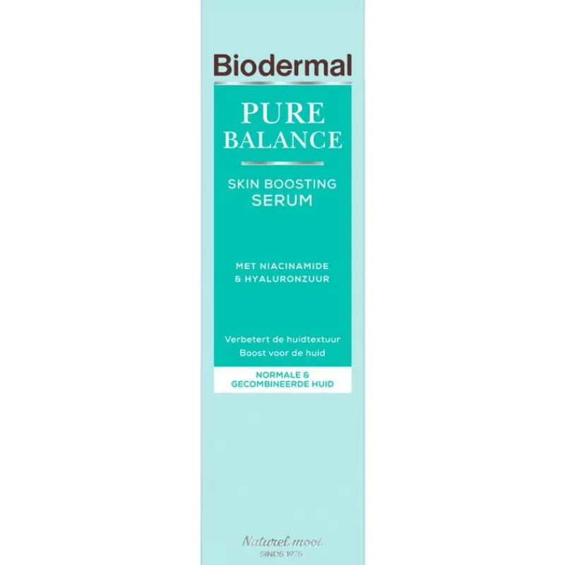 Biodermal Pure Balance Skin Boosting Serum is een hoog geconcentreerd serum speciaal ontwikkeld voor een volwassen huid met onzuiverheden en oneffenheden. De combinatie van actieve ingrediënten, zoals hyaluronzuur en niacinamide, hebben een intensieve en effectieve werking. Het serum is een dagelijkse boost voor de huid en heeft een lichte textuur die gemakkelijk door de huid wordt opgenomen. De formule verbetert en verfijnt de huidtextuur, geeft een intensieve hydratatie boost en vermindert onzuiverheden en oneffenheden.