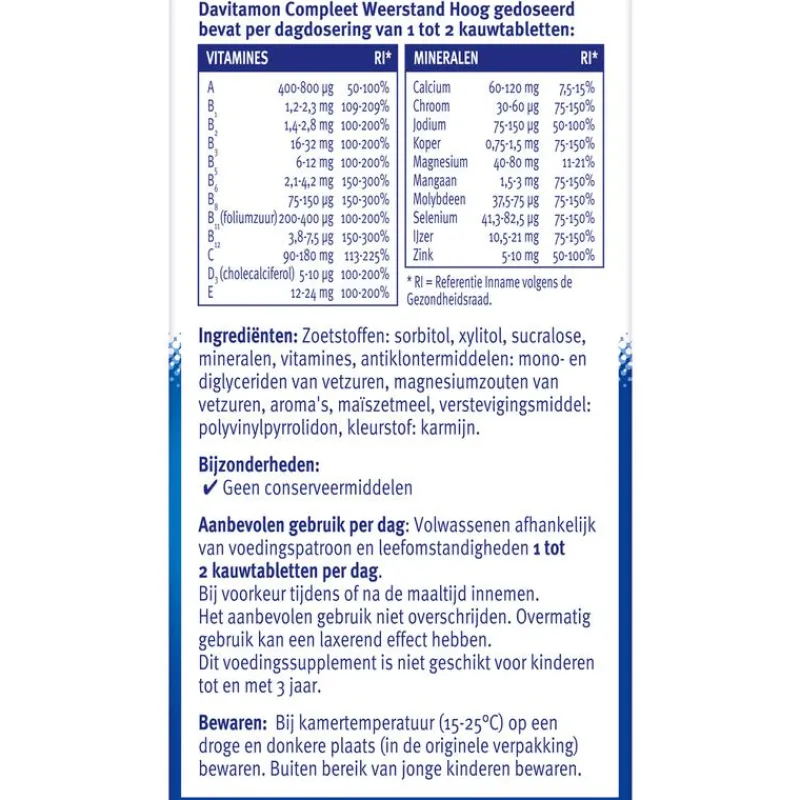 Davitamon Compleet Weerstand Forte Kauwtabletten zijn speciaal ontwikkeld voor volwassenen en hebben een lekkere bosvruchtensmaak. De kauwvitamines bevatten een extra hoge dosering van belangrijke vitamines (min. 200% van de ADH) en mineralen (min. 150% van de ADH) en is daarom: