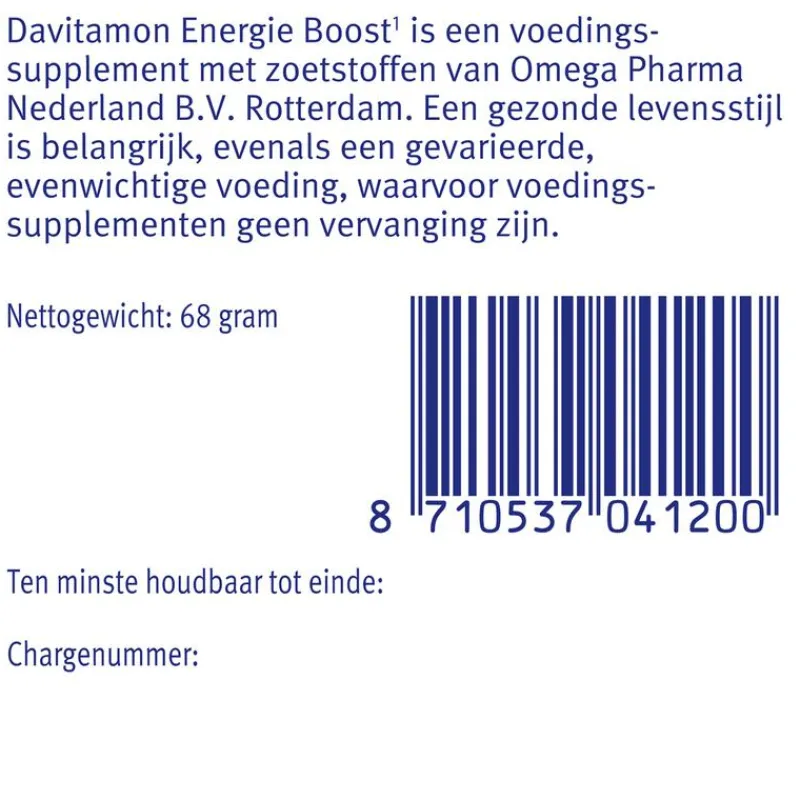 Om in een verhoogde behoefte aan energieleverende vitamines te kunnen voorzien, bevat Davitamon Energie Boost¹ Forte ter aanvulling op de voeding een extra hoge dosering (200% – 300% RI*) van vitamine B-Complex, vitamine C en vitamine E.
