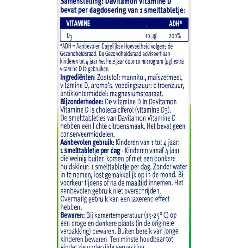 Is je kind jonger dan 4 jaar of komt je kind niet zo vaak buiten? Overweeg dan een voedingssupplement met vitamine D zoals Davitamon Vitamine D Kind Smelttabletten.