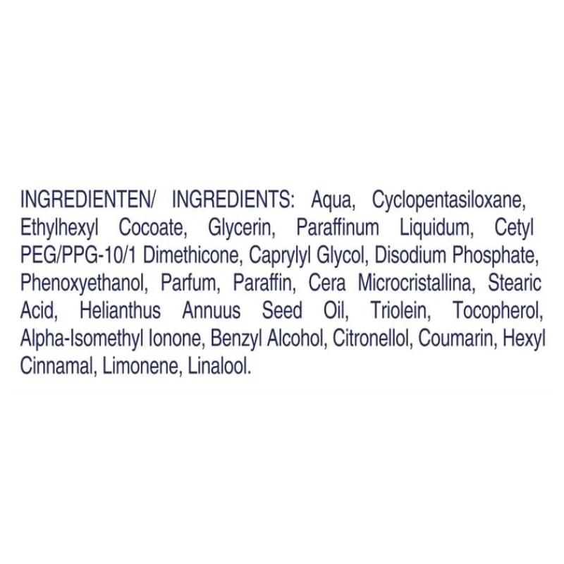 Aqua, Cyclopentasiloxane, Ethylhexyl Cocoate, Glycerin, Paraffinum Liquidum, Cetyl PEG/PPG-10/1 Dimethicone, Caprylyl Glycol, Disodium Phosphate, Phenoxyethanol, Parfum, Paraffin, Cera Microcristallina, Stearic Acid, Helianthus Annuus Seed Oil, Triolein, Tocopherol, Alpha-Isomethyl Ionone, Benzyl Alcohol, Citronellol, Coumarin, Hexyl Cinnamal, Limonene, Linalool