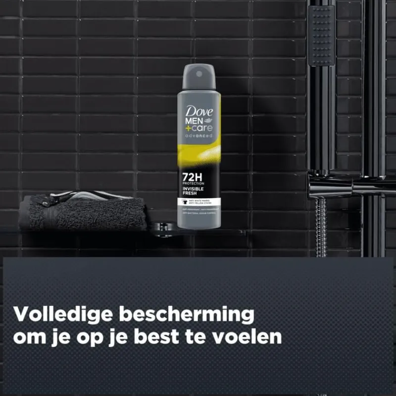 De Dove Men+Care Advanced Invisible Fresh Anti-Transpirant Deodorant Spray is ontworpen om vlekken te voorkomen en om je te beschermen tegen zweet en irritatie. Want het dragen van je favoriete kleding kan je het zelfvertrouwen geven om elke dag aan te kunnen. Daarom heb je een deodorant nodig die je kleding niet met gele of witte vlekken achterlaat. Warm weer en zweet zijn geen partij voor deze anti-transpirant spray. De formule met de revolutionare Triple Action Technologie beschermt tot 72 uur tegen zweet, geur en irritatie. Bovendien zorgt de frisse, energieke geur voor langdurig fris ruikende oksels. Dove Men+Care Advanced Invisible Fresh Anti-Transpirant Deodorant Spray helpt je je op je best te voelen. Deze niet-vlekkende anti-transpirant spray bevat tevens een 1/4 hydraterende crème om je huid te verzorgen. Huidirritatie door het gebruik van deodorant behoort tot het verleden want deze anti-transpirant zorgt voor gladde en gezond aanvoelende oksels. Je kleding beschermen: Deze niet-vlekkende anti-transpirant voor mannen is de oplossing tegen vlekken. Je hoeft je geen zorgen te maken over witte strepen en gele vlekken op je favoriete kleding. 72 uur bescherming: Laat zweet en geur je niet in de weg zitten als het buiten warm is. Deze mannelijke anti-transpirant spray is ontworpen om langdurige bescherming te bieden en je de hele dag een fris gevoel te geven waarop je kunt vertrouwen. Superieure verzorging: Deze anti-transpirant deodorant verzorgt ook je oksels. Verrijkt met 1/4 hydraterende crème, die de okselhuid hydrateert. Hierdoor voelt je huid de hele dag gehydrateerd en verzorgd aan.