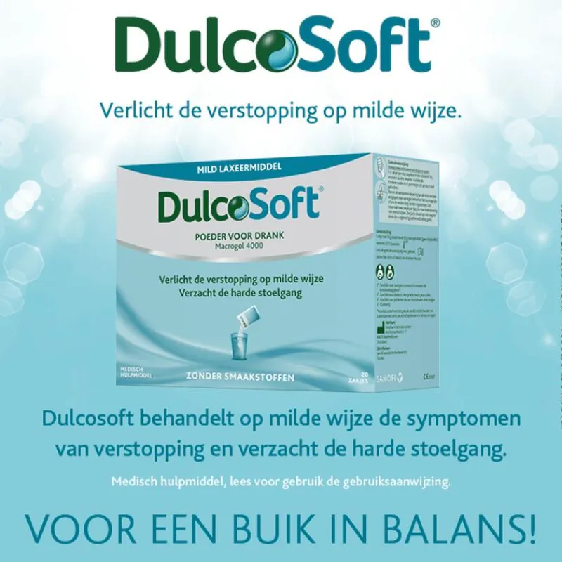 Dulcosoft Poeder is een medisch hulpmiddel die op milde wijze de symptomen van een verstopping verlichten. Met het poeder maakt u eenvoudig een drankje aan die er voor zorgt dat een harde stoelgang wordt verzacht. Dit is te danken aan de actieve stof Macrogol 4000. Macrogol 4000 vertraagt de opname van water uit de darm, waardoor de hoeveelheid water in de dikke darm verhoogt. Op deze manier wordt harde ontlasting zacht gemaakt en kunt u weer genieten van een natuurlijk gevoel van opluchting. Dulcosoft Poeder voor Drank is vrij van kunstmatige smaakstoffen.