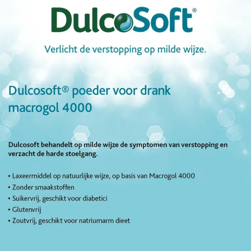 Dulcosoft Poeder helpt de verstopping op milde wijze te verlichten. Het poeder zorgt voor verzachting van de harde stoelgang. De werkzame stof van Dulcosoft is macrogol 4000, een osmotisch laxeermiddel. Macrogol 4000 is in staat in hoge mate water te binden. Het dient als drager voor vloeistof (water) en vertraagt de opname van water uit de darm, dit leidt tot een verhoogde hoeveelheid water in de dikke darm. Daardoor zal de harde ontlasting zacht worden en de ontlasting neemt toe in volume. Dit leidt tot meer beweging in de darmen en vergemakkelijkt de ontlasting. Dit geeft een natuurlijk gevoel van opluchting. Macrogol 4000 heeft een puur fysisch werkingsmechanisme: het wordt niet opgenomen door het lichaam en wordt onveranderd uitgescheiden.