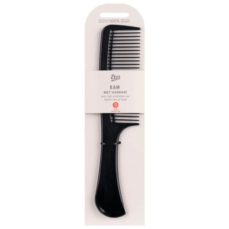 De Etos kam met handvat is ideaal voor het ontklitten en stylen van zowel nat als droog haar. Dankzij het stevige handvat met grip ligt de kam comfortabel in de hand, wat zorgt voor extra controle tijdens het kammen. Geschikt voor dagelijks gebruik en gemaakt van duurzaam materiaal, biedt deze kam een handige oplossing voor tijdens het ontklitten.