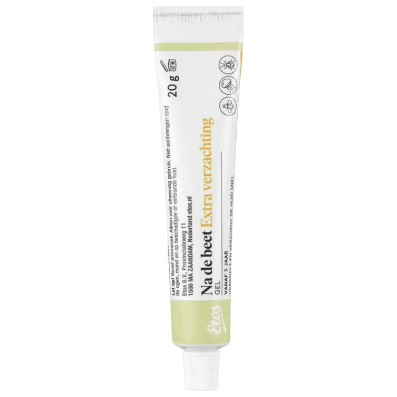 Etos Na De Beet Extra Verzachting Gel kalmeert de huid na insectensteken van onder andere wespen en bijen, beten of na aanraking met bijvoorbeeld kwallen. De tea tree oil heeft een ontsmettende werking, verzorgt de huid en helpt de huid sneller te genezen. De gel werkt effectief bij grotere steken en beten.