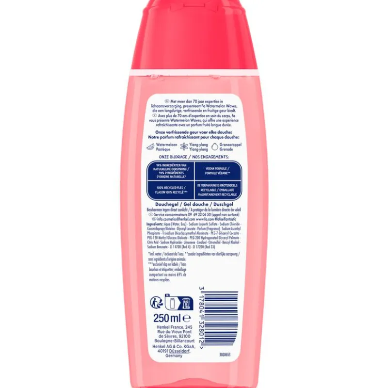Ontdek Fa Fiji Dream douchegel met de geur van watermeloen en ylang ylang. De vegan formule bevat 95% ingrediënten van natuurlijke oorsprong (incl. water).