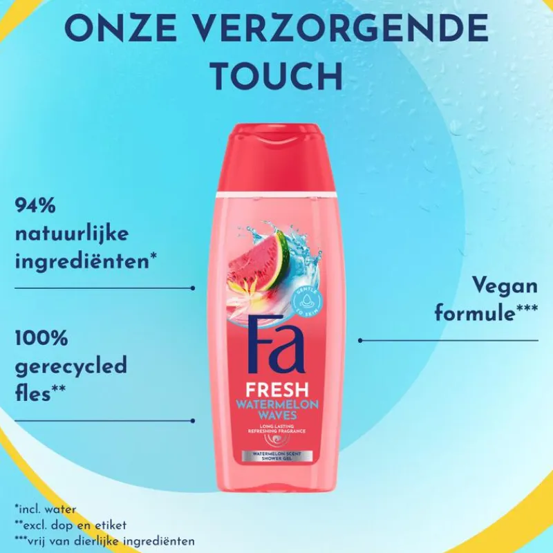 Gebruik Fa douchegel Stap 1: Neem een douche en maak je huid grondig nat, Stap 2: Breng de douchegel aan op je hele lichaam, Stap 3: Masseer de douchegel op je huid. Stap 4: Spoel alle restanten af voor het drogen.