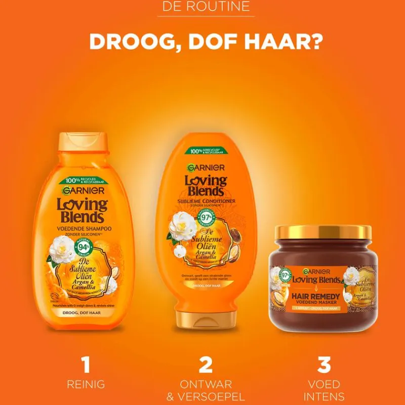 De Loving Blends Argan & Cameliaolie Shampoo van Garnier is speciaal voor droog en dof haar ontwikkeld. De voedende, glansgevende shampoo van 94% natuurlijke oorsprong bestaat uit twee sublieme oliën: – Eerlijk verhandelde, biologische Arganolie: Bevat vitamine E en natuurlijke Omega vetten. Vitamine E heeft de eigenschap droog haar te voeden en te herstellen, voor meer glans.Omega vetten maken het haar dan weer sterker. – Cameliaolie: Is hét Japanse beautygeheim voor mooi, dik en glanzend haar. Je haar wordt weer glanzend, soepel, intens zacht, en is makkelijker in model te brengen. De verfijnde textuur van dit recept zorgt ervoor dat je haar volledig omhuld wordt met een heerlijke geur van noten en bloemen. Formule zonder siliconen, voor een natuurlijk gevoel en zonder dierlijke ingrediënten & bijproducten in een 100% gerecyclede en recyclebare fles. De shampoo bevat biologische, eerlijk verhandelde biologische arganolie uit Marokko. Loving Blends is gecertificeerd door Cruelty Free International. Ontdek voor nog meer verzorging ook de bijhorende conditioner en het haarmasker.