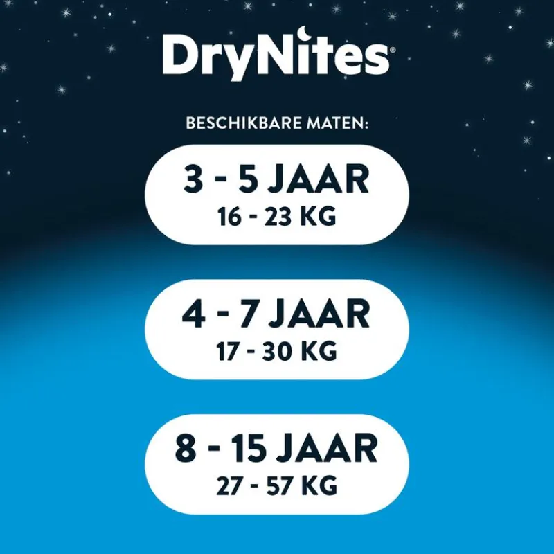 Overdag zindelijk, ’s nachts nog niet? DryNites nachtbroekjes bieden maximale bescherming en lijken door de leuke design op écht ondergoed. Dit geeft je kind meer zelfvertrouwen, want zo voelt jouw kind zich écht groot. Geen zorgen, je kind is niet de enige. Bedplassen komt veel vaker voor dan je denkt. Wees geduldig, ook al valt dit soms niet mee. DryNites absorberende broekjes zijn er om je door deze fase heen te helpen. Ze bieden onovertroffen bescherming voor een droge nacht en lijken op écht ondergoed door de leuke Disney-designs. Dit geeft je kind meer zelfvertrouwen, want zo voelt jouw kind zich écht groot. Bedplassen gaat meestal vanzelf over. Vertrouw tot die tijd op DryNites!