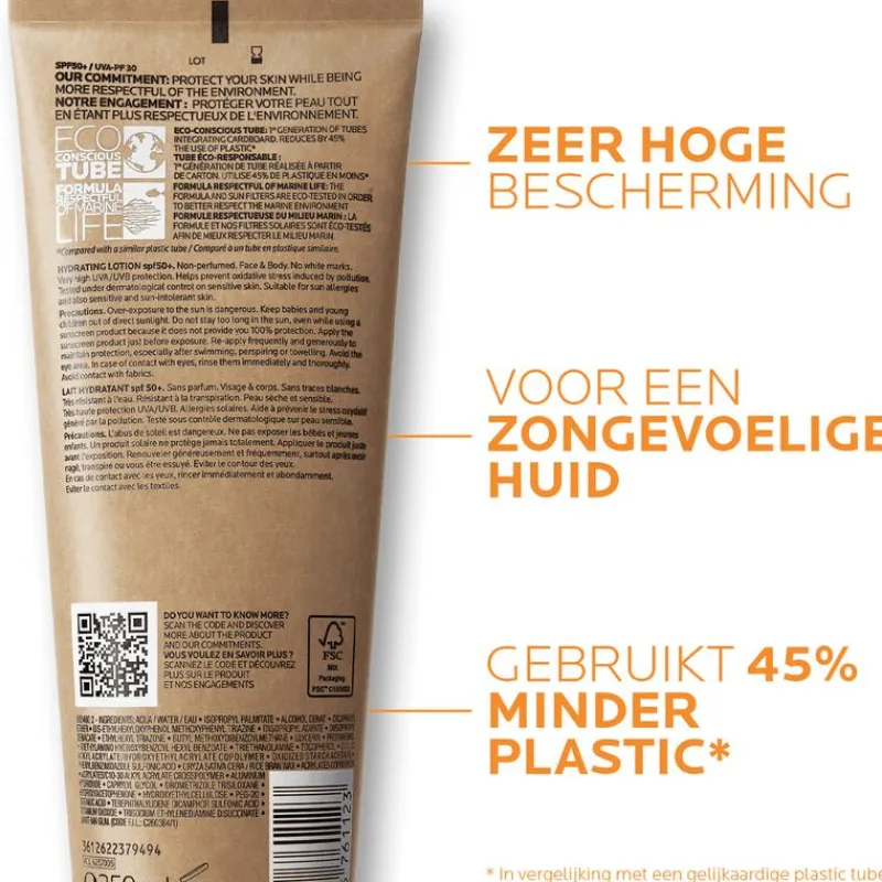La Roche-Posay Anthelios Melk SPF50+ is een zonnebrandcrème die ultrahoge UVA- en UVB – bescherming biedt. Bovendien is de crème geformuleerd met respect voor het zeeleven en de verpakking bestaat uit een duurzamere tube met geïntegreerd karton met 45% minder plastic dan gelijkwaardige plastic tube. La Roche-Posay heeft milieubewustzijn hoog op de agenda staan.