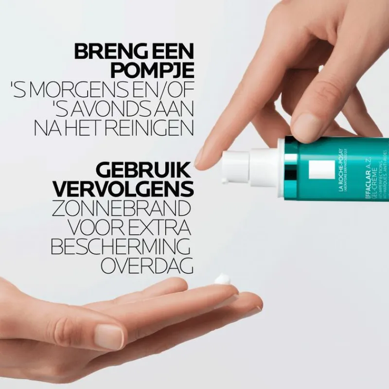 La Roche-Posay Effaclar A.Z. Gel-Crème is een dagelijkse hydraterende verzorging tegen onzuiverheden, pigmentvlekken en rimpels. De gel-crème is speciaal ontwikkeld voor een acnegevoelige huid bij volwassenen en vermindert terugkerende puistjes in slechts 7 dagen*. De formule met azelaïnezuur, salicylzuur en hyaluronzuur helpt niet alleen onzuiverheden te verminderen, maar pakt ook tekenen van huidveroudering, waaronder rimpels, dagelijks aan. De lichte gel-crème trekt snel in en hydrateert de huid intens voor een fluweelzachte finish. De effectiviteit van het product is klinisch bewezen op alle huidtypes.