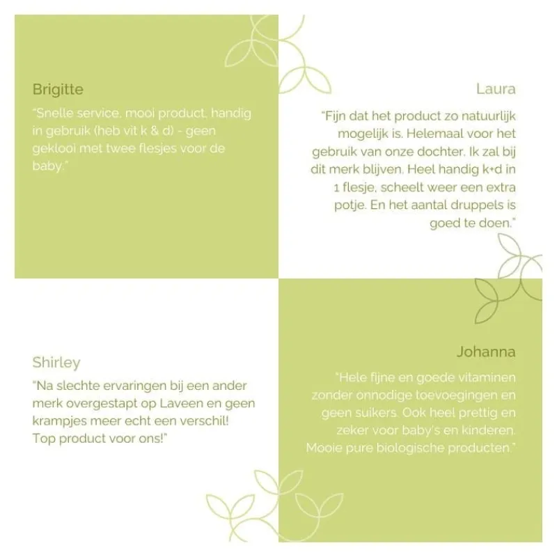 Laveen™ Olive Drops Vitamine D en K baby druppels zijn vitaminedruppels, gemaakt op basis van biologische olijfolie. Baby’s hebben behoefte aan vitamine D, maar in de eerste drie maanden na de geboorte zeker ook aan vitamine K. In onze Vitamine D en K baby druppels zitten voldoende vitamines om het advies van de Gezondheidsraad met betrekking tot de ADH oftewel de ‘Aanbevolen Dagelijkse Hoeveelheid’ aan vitamines D en K op te volgen. *