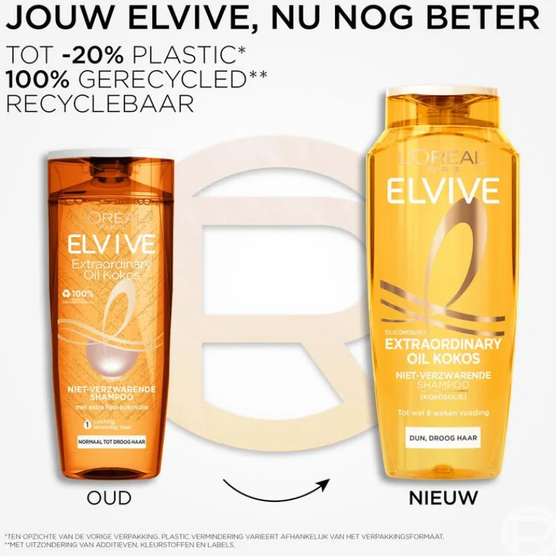 L’Oréal Paris Elvive Extraordinary Oil Fijne Kokos Niet-Verzwarende Shampoo is speciaal ontwikkeld voor dun, droog haar dat vaak dof en stug is, en vitaliteit mist. Het is verrijkt met fijne kokosolie voor zichtbare haartransformatie en intensieve voeding, zonder te verzwaren. Geef je haar tot wel 8 weken voeding*. De verzorgende formule van de L’Oréal Paris Elvive Extraordinary Oil Kokos Shampoo is siliconenvrij** en voedt het haar optimaal voor soepel en luchtig haar. Het verzacht de haarvezel voor stralend glanzend haar en de shampoo parfumeert het haar subtiel met de heerlijke geur van kokosnoot. Jouw Elvive, nu nog beter! Onze vernieuwde fles is gemaakt met tot -20% minder plastic*** en is gemaakt van 100% gerecycled plastic****. Daarnaast is de fles ook recyclebaar. *Eén fles = tot 8 weken gebruik, kan variëren afhankelijk van het gebruik en de lengte van het haar. **Voor een natuurlijk gevoel. ***Ten opzichte van de vorige verpakking. Plastic vermindering varieert afhankelijk van het verpakkingsformaat. ****Met uitzondering van de additieven, kleurstoffen en labels.