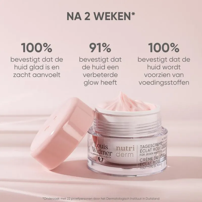 * De nutriderm Dagcrème Éclat Rosé UV 50 bevat verfijnde anti-ageing bestanddelen.