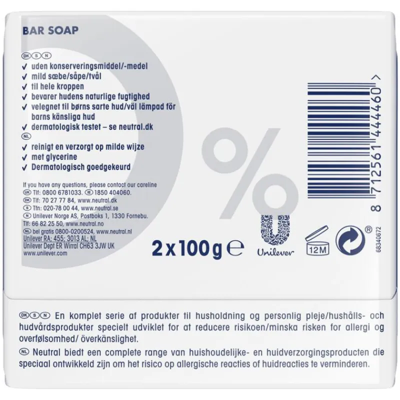 NEUTRAL ZEEP IS GEMAAKT VAN ZUIVERE INGREDIËNTEN DIE JE HUID MILD VERZORGT.• Geschikt voor de gevoelige huid.• 0% parfum en 0% kleurstof.• Dermatologisch getest en goedgekeurd.• Geschikt voor alle huidtypen en leeftijden.• Geschikt voor het hele lichaam.• Gemakkelijk in gebruik.