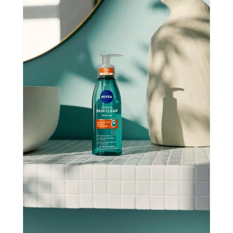 NIVEA DERMA Skin Clear Reinigingsgel 150ml is geformuleerd voor de onzuivere huid en bevat Salicylzuur en Niacinamide. Onze Reinigingsgel reinigt de huid, maakt verstopte poriën vrij, verwijdert overtollige talg, vermindert onzuiverheden en voorkomt het ontstaan van nieuwe onzuiverheden. De formule is vegan ** en klinisch getest*. *Huidverdraagzaamheid en effectiviteit op de huid met onzuiverheden dermatologisch en klinisch bewezen. **Geen ingrediënten van dierlijke oorsprong.