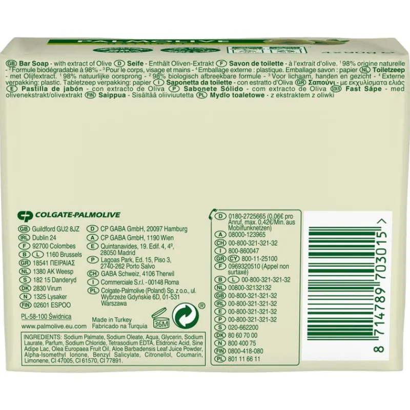 Zorg goed voor je huid door je te wassen met Palmolive Naturals Moisture Olijf Blokzeep. Of je dit stuk zeep nu gebruikt voor je handen of onder de douche, je huid voelt schoon, zacht en gehydrateerd aan dankzij de toevoeging van 100% olijvenextract. Laat je hele lichaam lekker ruiken met deze blokzeep. De missie van Palmolive is om de natuur binnen handbereik te brengen en je te inspireren meer balans te vinden in je dagelijkse hectische leven. Met een klein beetje natuur wil Palmolive je helpen om je weer meer mens te voelen. Palmolive producten zijn ontwikkeld voor mensen die zoeken naar verzorgingsproducten die rekening houden met je huid en met de planeet. Alle Palmolive Naturals producten bevatten zoveel mogelijk natuurlijke ingrediënten en hebben zo min mogelijk impact op het milieu.