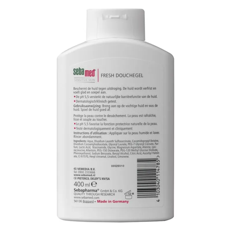 Water en zeep drogen de huid uit. Met Sebamed Fresh Douchegel kun jij altijd de dag fris beginnen of eindigen. Deze verfrissende douchegel is 100% zeepvrij en speciaal ontwikkeld voor dagelijks douchen. Het beschermt de huid tegen uitdroging. De huid wordt verfrist en voelt glad en soepel aan. Sebamed Fresh Douchegel is ontwikkelt voor en door dermatologen. De huidneutrale pH-waarde van 5,5 versterkt de natuurlijke beschermingslaag van de huid. Zo blijft de huid gezond en in topconditie. Ontwikkelt door en met dermatologen. Dermatologisch/klinisch getest.