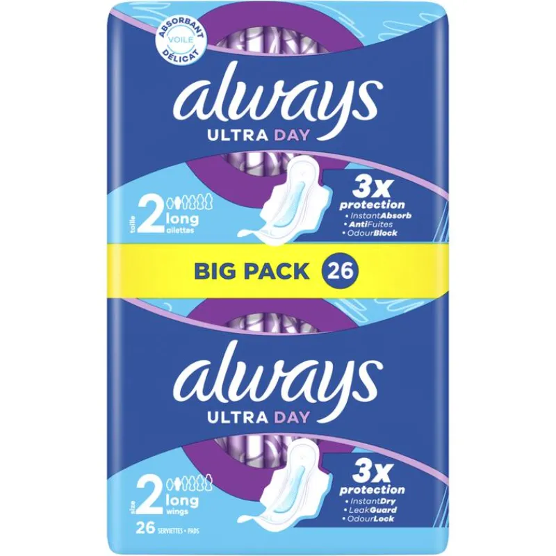Neem geen genoegen met minder dan drievoudige bescherming met ALWAYS Ultra Day Long (maat 2) maandverband met vleugels.