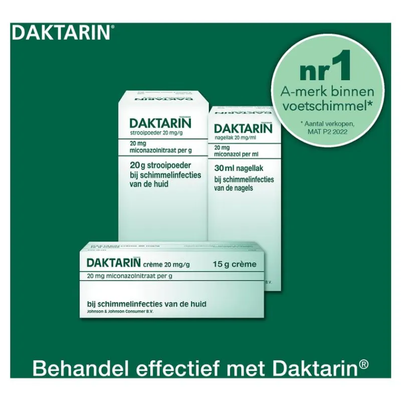 DAKTARIN® Poeder 2% is een geneesmiddel dat wordt gebruikt om huidinfecties te behandelen die voorkomen op handen, voeten en huidplooien (zoals bijvoorbeeld in de lies en onder de borst). Het poeder bevat miconazolnitraat dat vrijwel alle schimmels en bepaalde bacteriën doodt die de huid kunnen infecteren. DAKTARIN® Poeder 2% helpt de huid te drogen om zo het letsel doeltreffend te behandelen. DAKTARIN® Poeder is geschikt voor gebruik bij volwassenen en kinderen van alle leeftijden. De behandeling varieert van 2 tot 6 weken. De behandeling dient te worden voortgezet tot minimaal een week na het verdwijnen van alle tekens en symptomen.