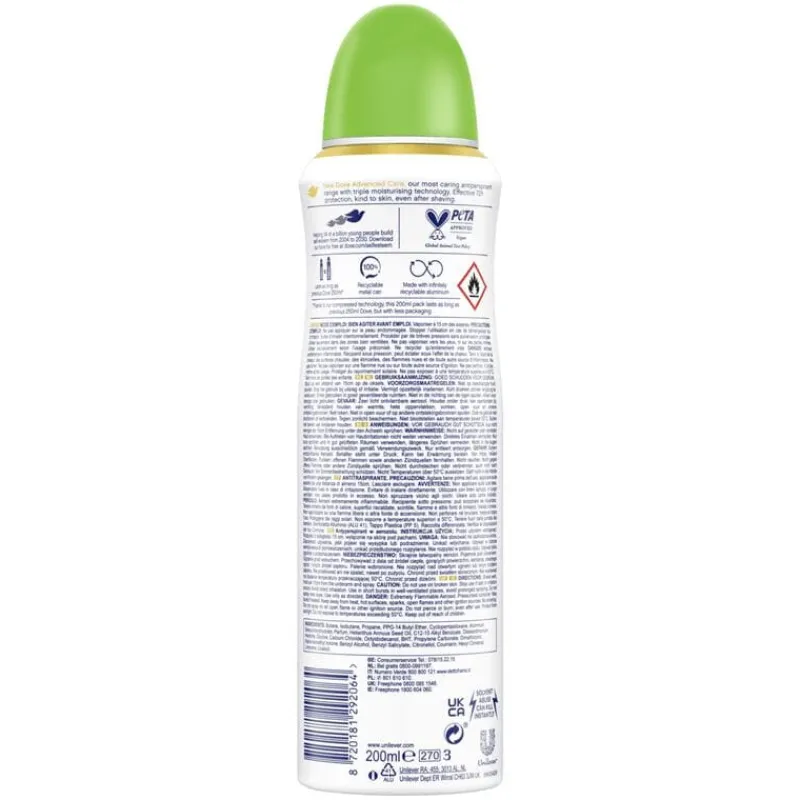 Dove Advanced Care Go Fresh Cucumber & Green Tea Anti-Transpirant Deodorant Spray is geïnspireerd op de natuur. De komkommer zorgt voor verfrissing, terwijl je van de geur van groene thee een rustig en ontspannen gevoel krijgt. Daarnaast geeft de deodorant de vertrouwde bescherming die je gewend bent van Dove. Dat betekent 72 uur lang bescherming tegen zweet. De Dove Advanced Care anti-transpiranten maken deel uit van de meest verzorgende lijn van Dove, met de verbeterde gepatenteerde formule zijn ze zacht voor de huid. Het Advanced Care assortiment van Dove biedt met de Triple Moisturising technologie tot 72 uur bescherming tegen zweet. De hele dag een fris en verzorgd gevoel – wat de dag je ook brengt! Deze deodorant spray met verzorgende eigenschappen van komkommer helpt om je gevoelige huid te herstellen van irritatie veroorzaakt door het scheren. De semi-compressed spuitbus van 200 ml gaat even lang mee als de gewone versie van 250 ml, bovendien zorgt onze compressed technologie dat onze deodorants hun gas langzamer afgeven, zodat ze ook milder zijn voor de huid.