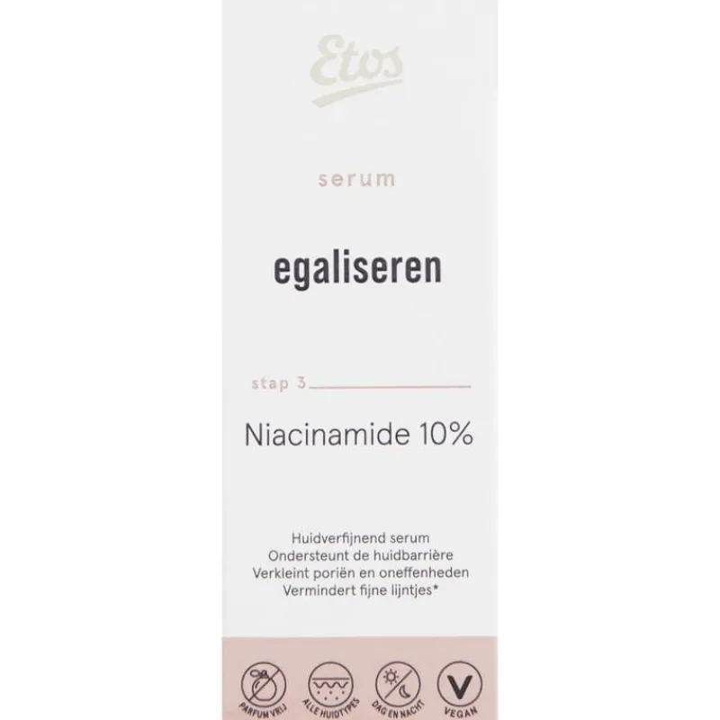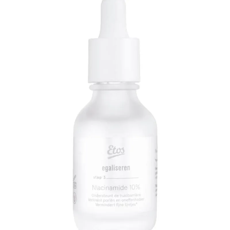 Etos Niacinamide 10% is een huid verfijnend serum. Het helpt de huid te regenereren en versterkt de huidbarrière.