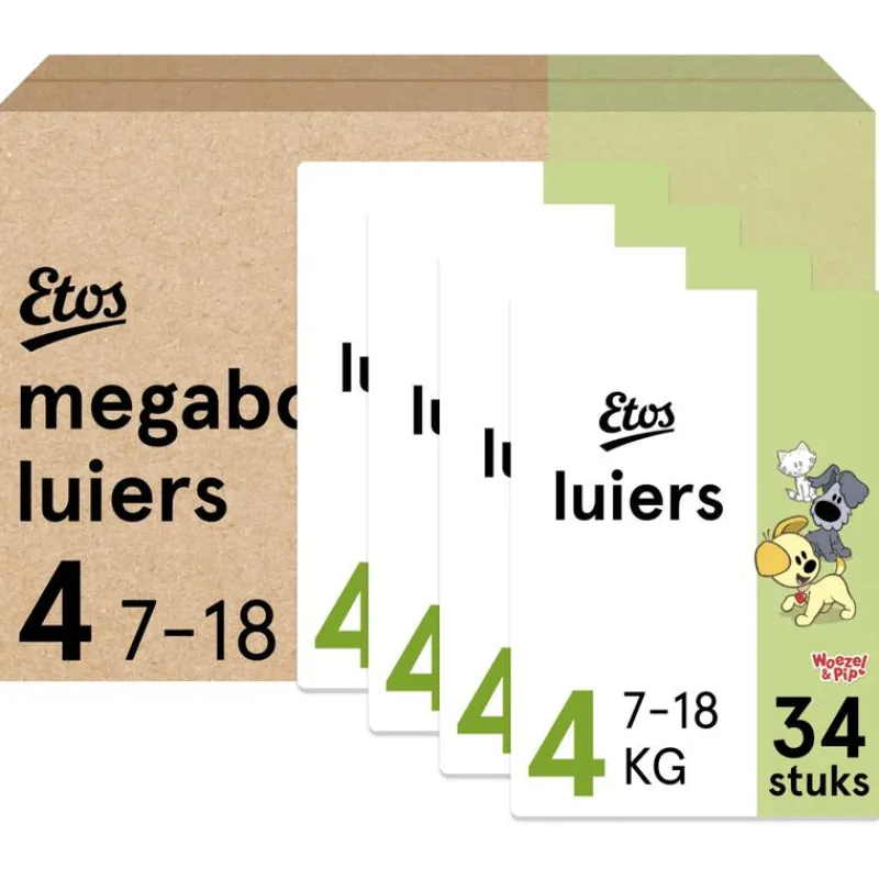 • Woezel & Pip design :Etos Woezel & Pip Luiers hebben een exclusief Woezel & Pip design. In de verpakking zitten 2 verschillende soorten designs.