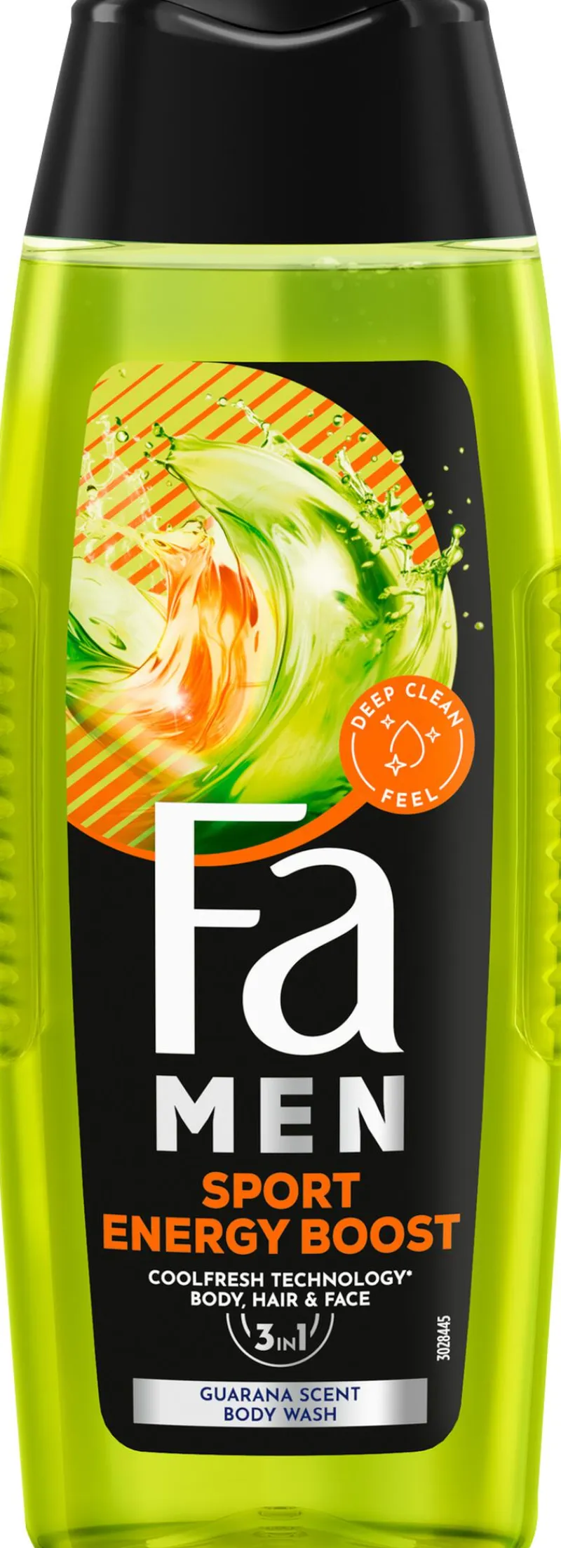Ontdek Fa Men Sport Energy Boost 3 in 1 douchegel voor lichaam, gezicht en haar met de geur van guarana en ginseng. De vegan formule bevat 95% ingrediënten van natuurlijke oorsprong (incl. water).