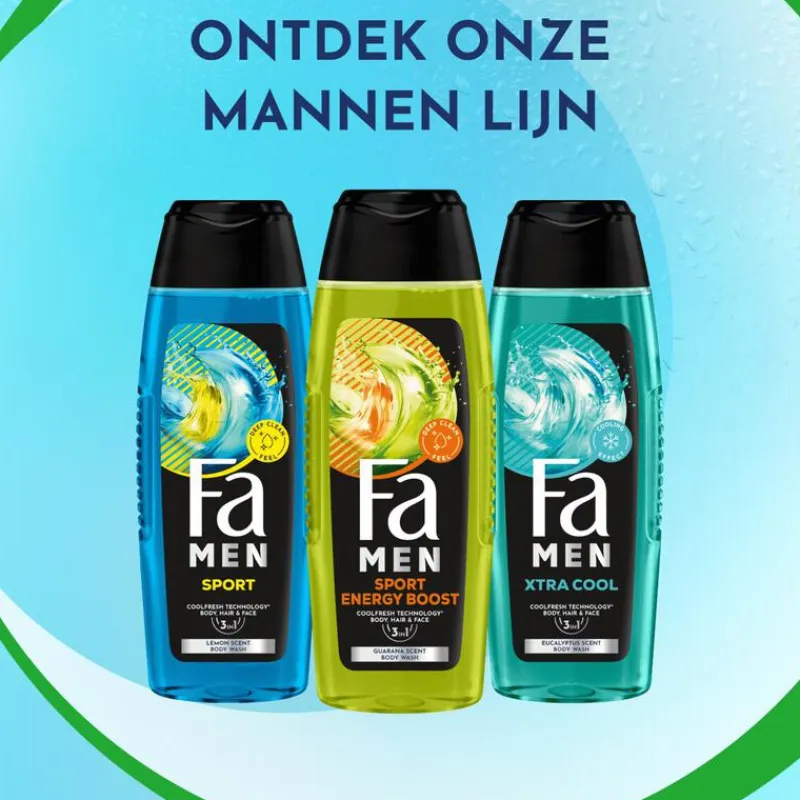 Fa, Durf te ontdekken! Fa biedt een innovatieve lichaamsverzorgingslijn, die de zintuigen verwent en de huid een onweerstaanbaar gevoel geeft. Van zoet tot fruitig, bloemig of gewoon lekker fris, Fa biedt voor elk avontuur een passende douchegel en deodorant. Verfris je lichaam en laat je zintuigen elke dag weer een andere wereld ontdekken.