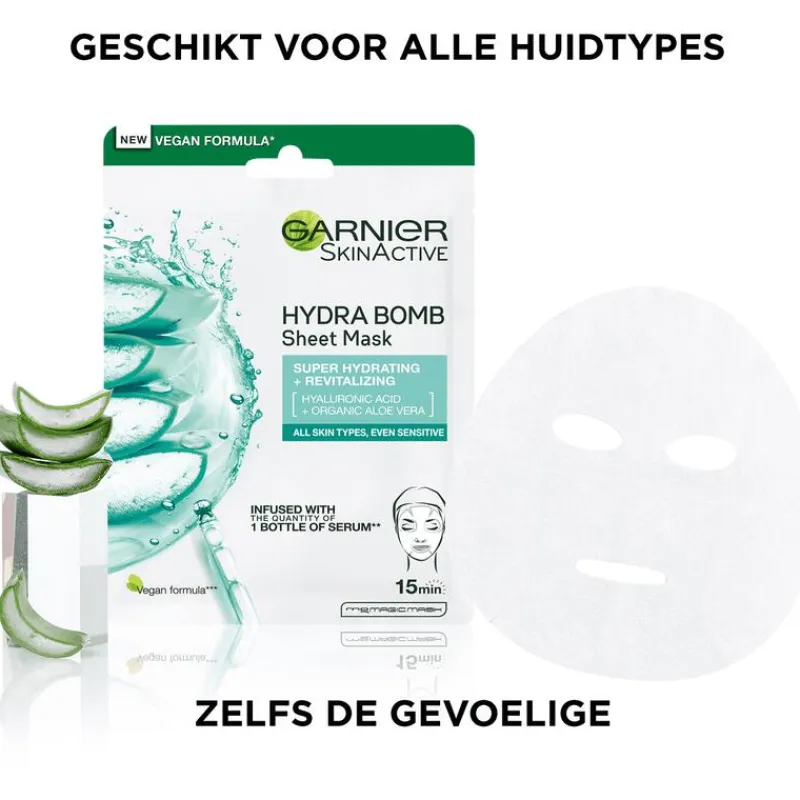 Ready, set, boost! Geef jouw huid een hydratatieboost in slechts 15 minuten! Dit gezichtsmasker is doordrenkt met een hoeveelheid van een vol flesje serum**, verrijkt met hyaluronzuur & Aloe Vera voor een verfrissend & revitaliserend effect. Geschikt voor een gevoelige huid.