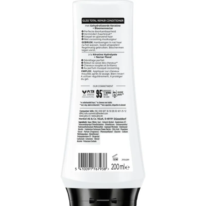 Gliss conditioner biedt diepgaand herstel en vermindert haarbreuk (vs. onbehandeld haar). Het geeft het haar perfecte doorkambaarheid. Deze regenererende conditioner maakt het haar glad en zacht, laat het soepel en gezond glanzen. Met cocooning muskusgeur. 95% van de ingrediënten is van natuurlijke oorsprong (inclusief water). Alle Gliss haarverzorgingsproducten zijn gecertificeerd door PETA.
