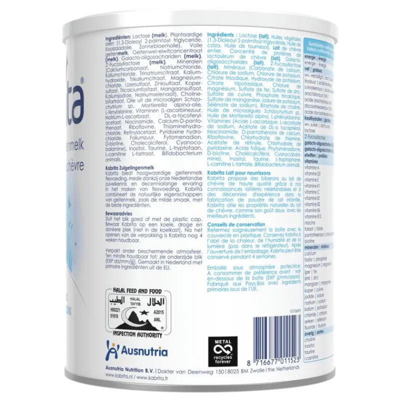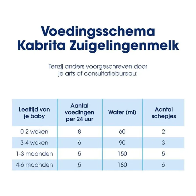 Verpakt onder beschermende atmosfeer.Borstvoeding is de meest geschikte voeding voor je baby. Indien je geen borstvoeding geeft of wilt overstappen op flesvoeding kan Kabrita Zuigelingenmelk (0-6 maanden) gebruikt worden. Kabrita Zuigelingenmelk is geschikt vanaf de geboorte. Gebruik Kabrita Zuigelingenmelk in overleg met je arts of consultatiebureau. Volg altijd de instructies op het blik, tenzij anders voorgeschreven.