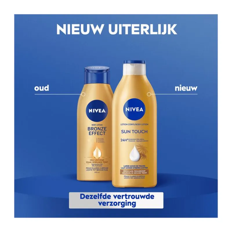 Geef de huid een natuurlijke bruine tint met NIVEA Bronze Effect Bodylotion. Dit is niet alleen een voedende en hydraterende bodylotion, maar ook een effectieve zelfbruiner. Door je huid dagelijks in te smeren met de zelfbruiner bodylotion ontstaat er geleidelijk een gebruind effect. Geniet van een gelijkmatige teint en laat je huid stralen dankzij de verzorgende bestanddelen die tot wel 24 uur lang hydratatie bieden. Je huid voelt heerlijk zacht aan en oogt binnen vijf dagen bruiner.