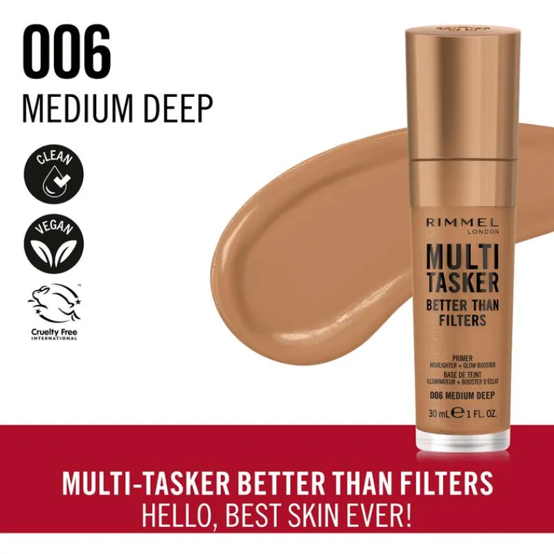 HELLO BEST SKIN EVER. BETER DAN WELKE FILTER DAN OOK: EEN PRACHTIGE GLOW OP JE MOOISTE HUID OOIT. Echte glow, beter dan een filter, op je mooiste huid ooit: met de 3-in-1 huidprimer, glowbooster en highlighter Multi-Tasker Better Than Filters!• Draag jouw glow op jouw manier met de Multi-Tasker Better Than Filters gezichtsprimer, glowbooster en highlighter: kan zonder jouw basismake-up aangebracht worden, maar ook gemengd met, onder of op jouw basismake-up• De vederlichte, gemakkelijk te blenden formule is verrijkt met natuurlijke biopeptiden, vitamine C en E. Je huid voelt goed doorvoed en gerevitaliseerd aan en ziet er in slechts 4 weken beter uit.• De lichtweerkaatsende pigmenten geven de huid een perfect stralende en zachte glow: social mediafilters heb je niet meer nodig• De Multi-Tasker Better Than Filters is verkrijgbaar in 8 op de huid afgestemde tinten en is dierproefvrij en vegan