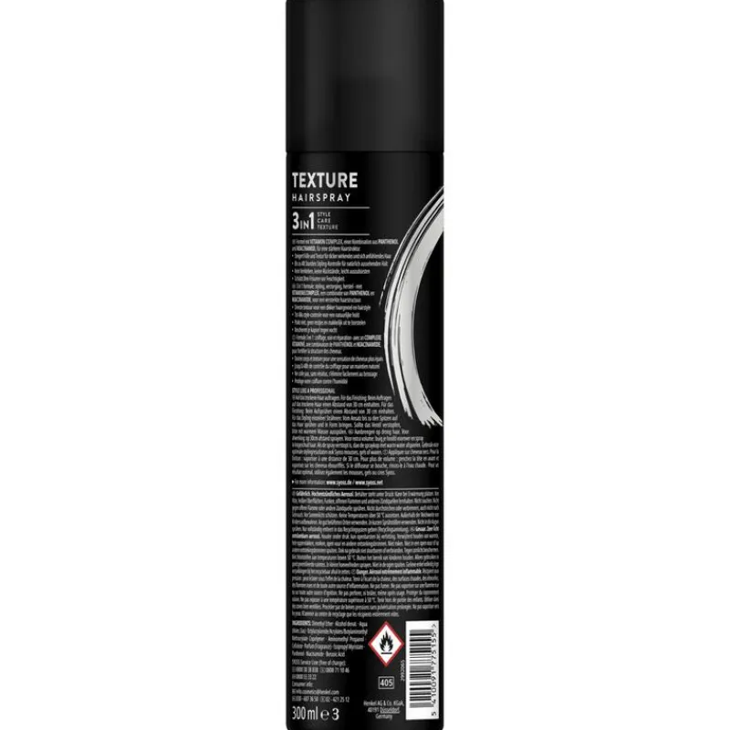 - lon- geïnspireerde Syoss Texture Haarspray, ontwikkeld met en getest door kappers, geeft directe textuur aan het haar en een dikker haargevoel, voor volle salon looks thuis.