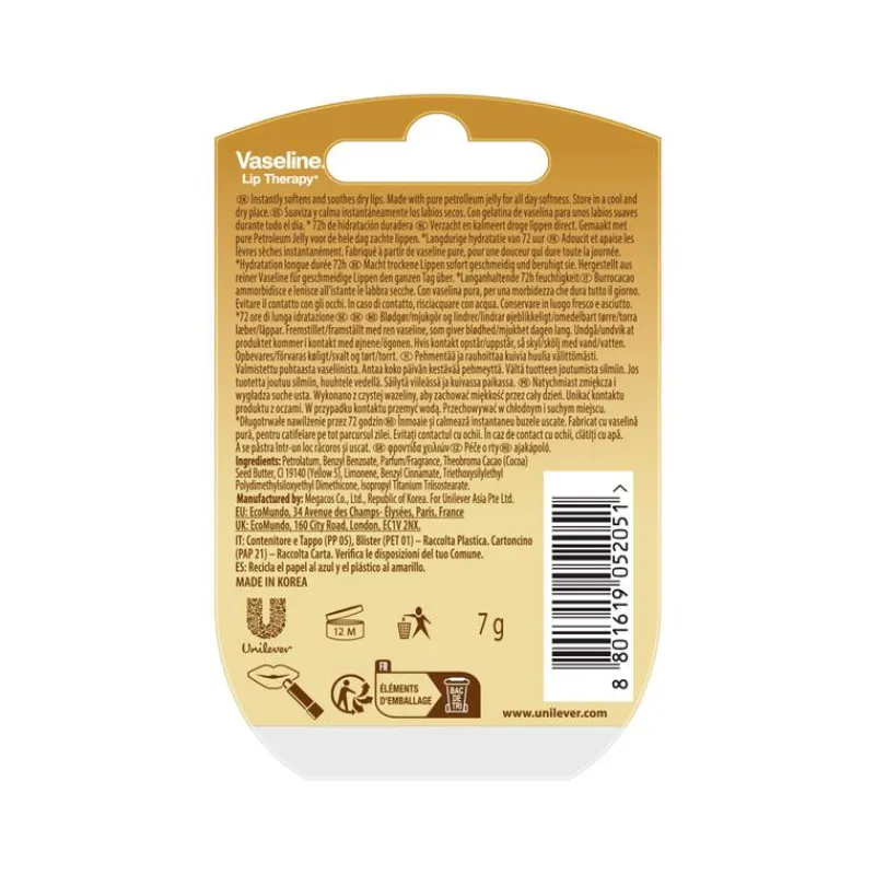 Vaseline Lip Therapy Crème Brûlée is gemaakt met Vaseline Jelly en helpt droge lippen te genezen en te voorkomen door vocht vast te houden. Het zorgt voor langdurige hydratatie en voegt een lichte geur van crème brûlée toe. Helpt droge lippen te kalmeren en te genezen door vocht vast te houden, wat resulteert in mooie, zichtbaar gezonde lippen.
