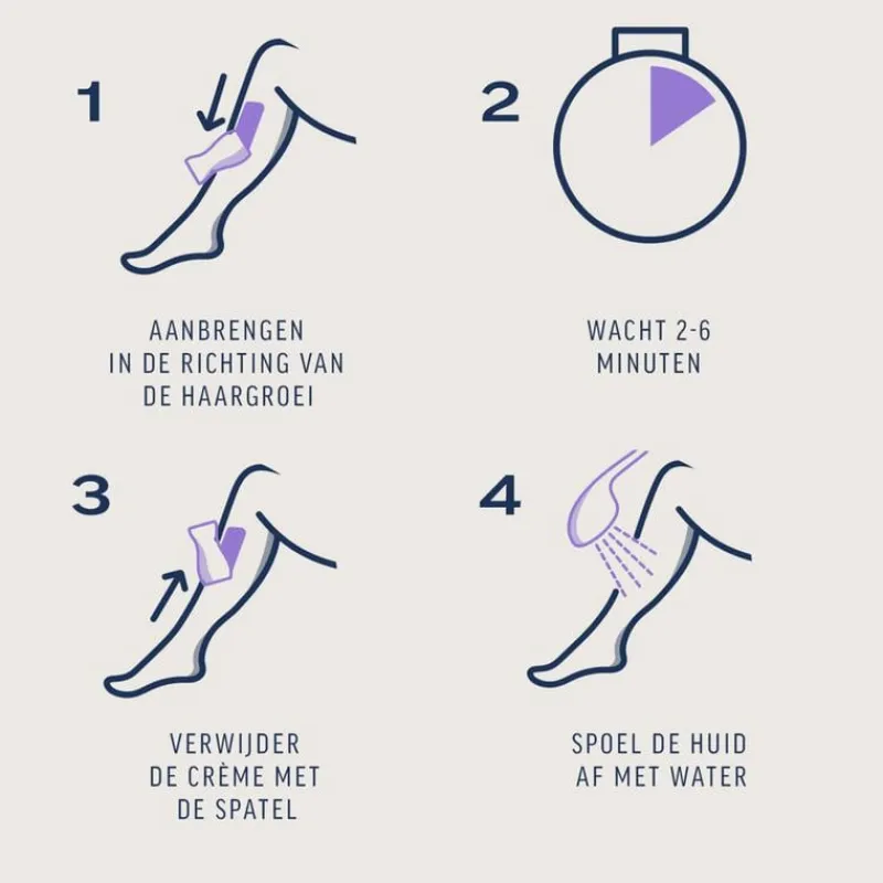 Laat het product niet langer dan 6 minuten op de huid. Geschikt voor gebruik op armen, benen en oksels en volledige schaamstreek inclusief uitwendige schaamlippen. VERMIJD CONTACT MET DE BINNENSTE SCHAAMLIPPEN EN SLIJMVLIEZEN. NIET GESCHIKT voor gebruik op het gezicht, hoofd, borst of op andere lichaamsdelen. Niet gebruiken op koortslip, littekens, moedervlekken, vlekkerige, kapotte, geïrriteerde of zonverbrande huid of op huid die in het verleden een negatieve reactie op ontharingscrèmes heeft gehad.