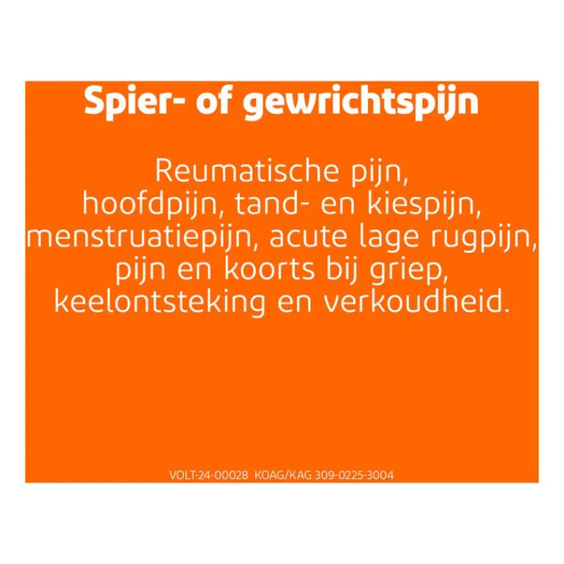 Niet gebruiken bij allergie voor één van de stoffen in dit geneesmiddel.Bij maagdarmklachten/ -zweren, maagbloeding, perforatie maagdarmkanaal, ernstige lever-/ nierfunctiestoornis of hartfalen, afwijking beenmerg, een bloedziekte, actieve bloedingen (ook in hersenen) of tekort bloedplaatjes. Overgevoeligheid voor NSAID’s, zoals diclofenac, aspirine en ibuprofen. Tijdens de laatste 3 maanden van de zwangerschap.,Indicatie: Reumatische pijn, hoofdpijn, kiespijn, menstruatiepijn,acute lage rugpijn, spier-, gewrichtspijn.