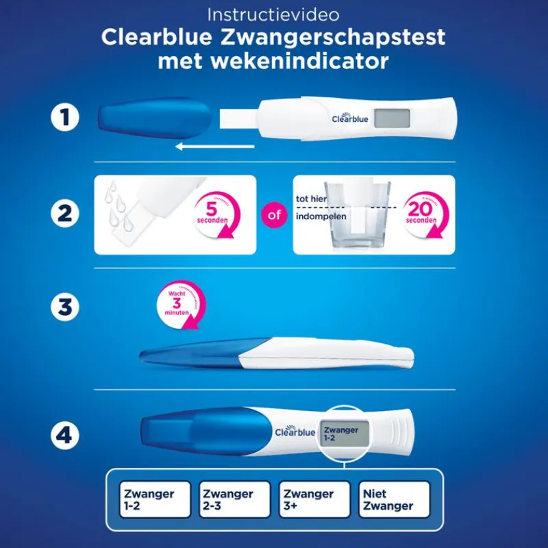 Lees altijd eerst de bijsluiter van uw medicijnen voordat u een test uitvoert. Een onterechte positieve uitslag kan worden veroorzaakt door medicatie die hCG bevat en door bepaalde zeldzame medische aandoeningen. Een buitenbaarmoederlijke of recente zwangerschap (zelfs als de zwangerschap niet is voldragen) kan misleidende uitslagen opleveren. Als u (bijna) in de menopauze bent, kan u ook een onterechte uitslag Zwanger krijgen terwijl u niet zwanger bent. De test zou NIET moeten worden beïnvloed door hormoonbehandelingen met clomifeencitraat, reguliere pijnstillers, alcohol, antibiotica of de anticonceptiepil. Als u een onverwachte uitslag krijgt, dient u deze te bespreken met uw huisarts. Bij meerlingzwangerschappen en buitenbaarmoederlijke zwangerschappen kan de wekenindicator een verkeerde uitslag geven.Dit digitale IVD-apparaat voldoet aan de vereisten voor emissie en immuniteit van EN 61326-2-6. De EMC-tegenmaatregelen die in dit elektronische instrument zijn gebruikt, geven een redelijke bescherming tegen de effecten van elektromagnetische interferentie die vaak in de thuisomgeving voorkomt. De volgende preventieve waarschuwingen zijn van toepassing op apparatuur die voldoet aan EN 61326-2-6. a) Gebruik van dit instrument in een droge omgeving, vooral als er synthetische materialen aanwezig zijn (synthetische kleding, tapijten enz.) kan schadelijke statische ontladingen veroorzaken die foutieve uitslagen kunnen veroorzaken. b) Gebruik dit instrument niet in de nabijheid van bronnen van sterke elektromagnetische straling (bijv. mobiele telefoons), omdat deze de juiste werking kunnen verstoren.*Laat u weten hoeveel weken (Clearblue digitale zwangerschapstest met wekenindicator): het aantal weken na bevruchting wordt afgebeeld als 1-2, 2-3 of 3+. *Net als 2 testen in 1 (Clearblue digitale zwangerschapstest met wekenindicator): vertelt u of u zwanger bent en hoe ver u bent. *Het meest verkochte merk van zwangerschaps- en vruchtbaarheidstesten voor thuisgebruik ter wereld. Gebaseerd op internationale verkoopcijfers in bijna 20 landen, verzameld met behulp van onafhankelijke marktonderzoeksgegevens. *Meer dan 99% nauwkeurig: meer dan 99% nauwkeurig bij het detecteren van zwangerschap vanaf de dag dat uw menstruatie zou moeten beginnen (Clearblue zwangerschapstesten). Meer dan 99% nauwkeurig bij het detecteren van de LH-piek (Clearblue ovulatietesten). 99% nauwkeurig bij het detecteren van de LH-piek (Clearblue geavanceerde vruchtbaarheidsmonitor). *Clearblue is veruit het nauwkeurigst: meer dan 99% nauwkeurig bij het detecteren van zwangerschap vanaf de dag dat uw menstruatie zou moeten beginnen (Clearblue zwangerschapstesten). Meer dan 99% nauwkeurig in het detecteren van de LH-toename (Clearblue ovulatietesten). *Net zo nauwkeurig als een echo om te zien hoelang u zwanger bent (Clearblue digitale zwangerschapstest met wekenindicator): weken komt in 97% overeen met de uitslag van latere echo-onderzoeken. Dit is op basis van een onderzoek onder 187 vrouwen waarbij het aantal weken werd vergeleken met een echo-onderzoek. *Snelle uitslag na 1 minuut (Clearblue zwangerschapstest met snelle detectie en Clearblue Flip & Click zwangerschapstest): de uitslag Zwanger kan vanaf de dag van de gemiste menstruatie al na 1 minuut verschijnen. Wacht 3 minuten om de uitslag Niet Zwanger te bevestigen. *Uitslagen 6 dagen voor uw gemiste menstruatie (Clearblue ultravroege zwangerschapstest): 79% van de uitslag Zwanger kan 6 dagen voor uw gemiste menstruatie worden gedetecteerd. *Uitslagen 6 dagen voor uw gemiste menstruatie (Clearblue digitale ultravroege zwangerschapstest): 78% van de uitslag Zwanger kan 6 dagen voor uw gemiste menstruatie worden gedetecteerd. *Uitslagen 6 dagen voor uw gemiste menstruatie (Clearblueultravroege GEAVANCEERDE zwangerschapstest): 77%van de uitslag Zwanger kan 6 dagen voor uw gemiste menstruatie worden gedetecteerd. *Uitslagen 5 dagen voor uw gemiste menstruatie (Clearblue digitale zwangerschapstest met