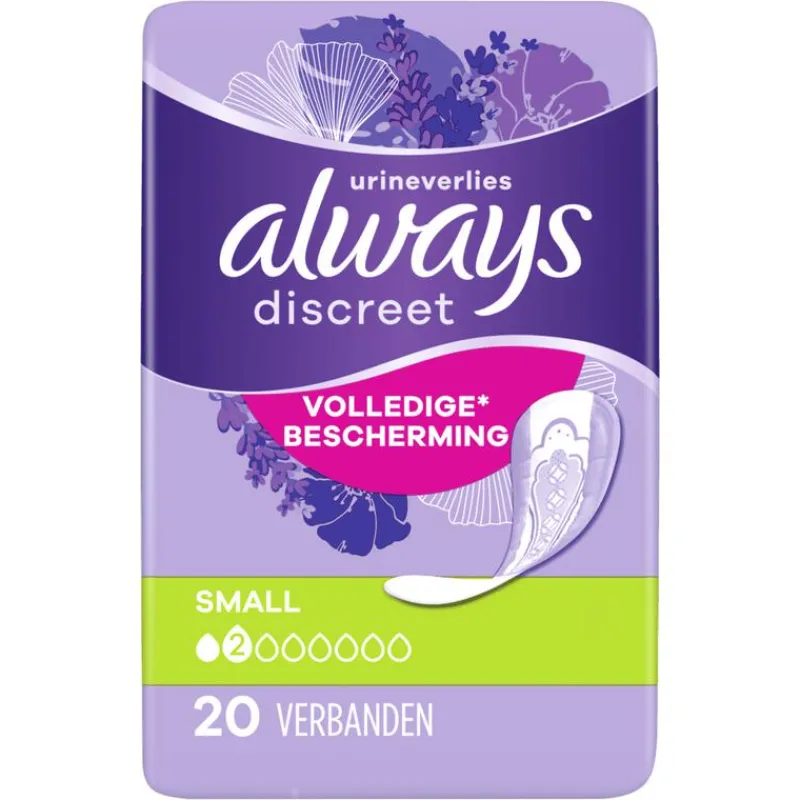 Always Discreet verband voor urineverlies Small biedt volledige* bescherming en een discrete pasvorm. Elk verband is ontworpen om betrouwbare bescherming tegen lekken te bieden, geurtjes te neutraliseren en onmiddellijk te absorberen. Bovendien is het zacht voor de huid en sluit het mooi aan op je lichaam. Always Discreet verband Small Plus biedt optimale bescherming en discretie, zodat je je zelfverzekerd kunt voelen wanneer lachen of niezen urineverlies veroorzaakt. *Gebaseerd op onze 5 dimensies van bescherming: betrouwbare bescherming bij urineverlies, onmiddellijke absorptie, bescherming tegen geurtjes, discreet design, zacht voor de huid.