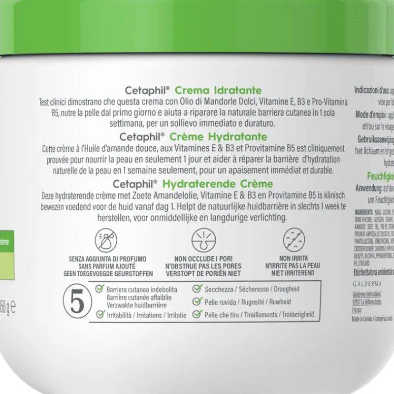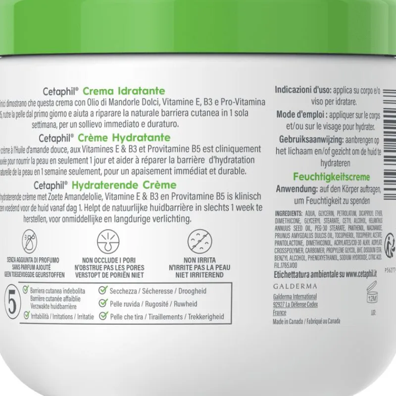 Cetaphil Hydraterende Crème is een rijke, niet vette, vocht inbrengende crème voor gezicht en lichaam. De crème is speciaal samengesteld volgens een nieuwe en verbeterde formule die een door dermatologen onderschreven mix van Vitamine B3, Provitamine B5 en hydraterende Glycerine bevat, om de weerstand van de gevoelige huid te helpen verbeteren. De hydraterende crème is verrijkt met Zoete Amandelolie en helpt om het vochtgehalte van de huid intensief aan te vullen en vochtverlies te voorkomen.