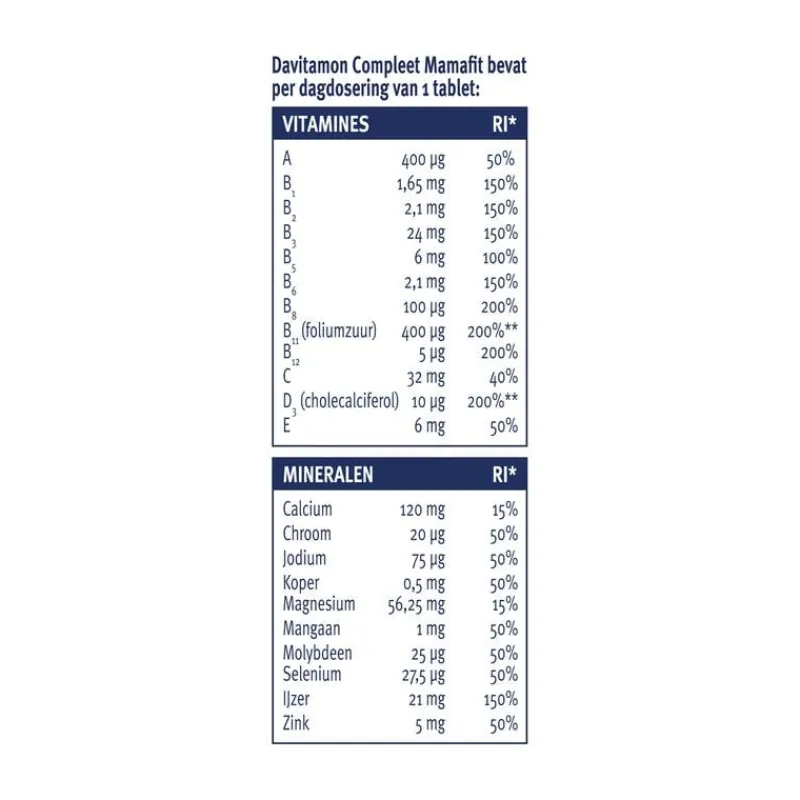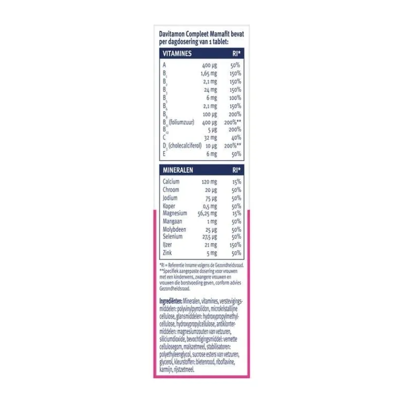 Speciaal voor de periode na de zwangerschap combineert Davitamon MamaFit de belangrijkste vitamines en mineralen in één tablet. Davitamon MamaFit helpt je om aan te sterken na de bevalling, je opnieuw fit te voelen en is goed voor de weerstand en het energieniveau.