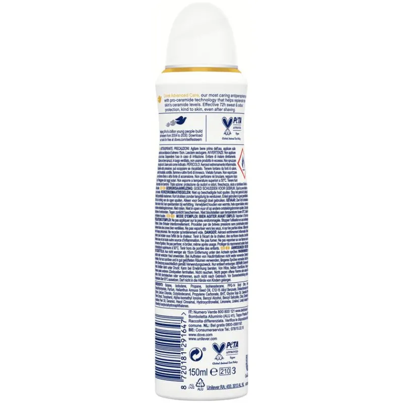 De Dove Advanced Care Matcha Green Tea Anti-Transpirant Deodorant Spray beschermt tegen zweet én is lief voor je oksels. Het Advanced Care-assortiment van Dove met de verbeterde formule met Pro-Ceramideserum en hyaluronzuur maakt deel uit van de meest verzorgende lijn van Dove. De spray biedt onmiddellijke verlichting na het scheren, helpt de okselhuid te herstellen en beschermt tot 72 uur tegen zweet en lichaamsgeur. Het hyaluronzuur helpt om het vochtgehalte van je huid op peil te houden. Bovendien bevat deze milde formule 0% alcohol**. De hele dag een fris en verzorgd gevoel – wat de dag je ook brengt! **Ethylalcohol