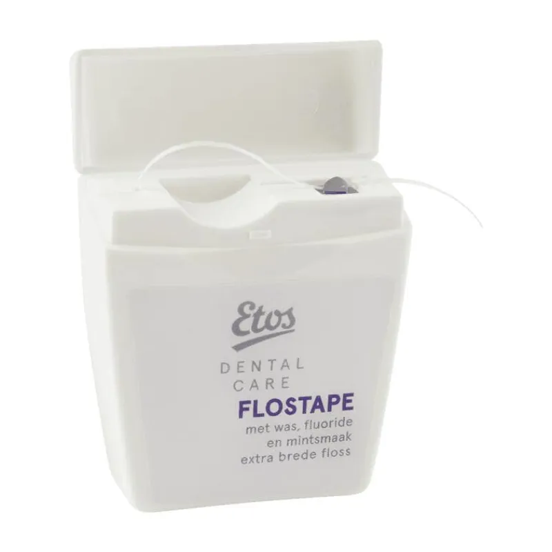 Etos flostape verwijdert plak en etensresten tussen de tanden en op plaatsen waar de tandenborstel niet goed bij komt.